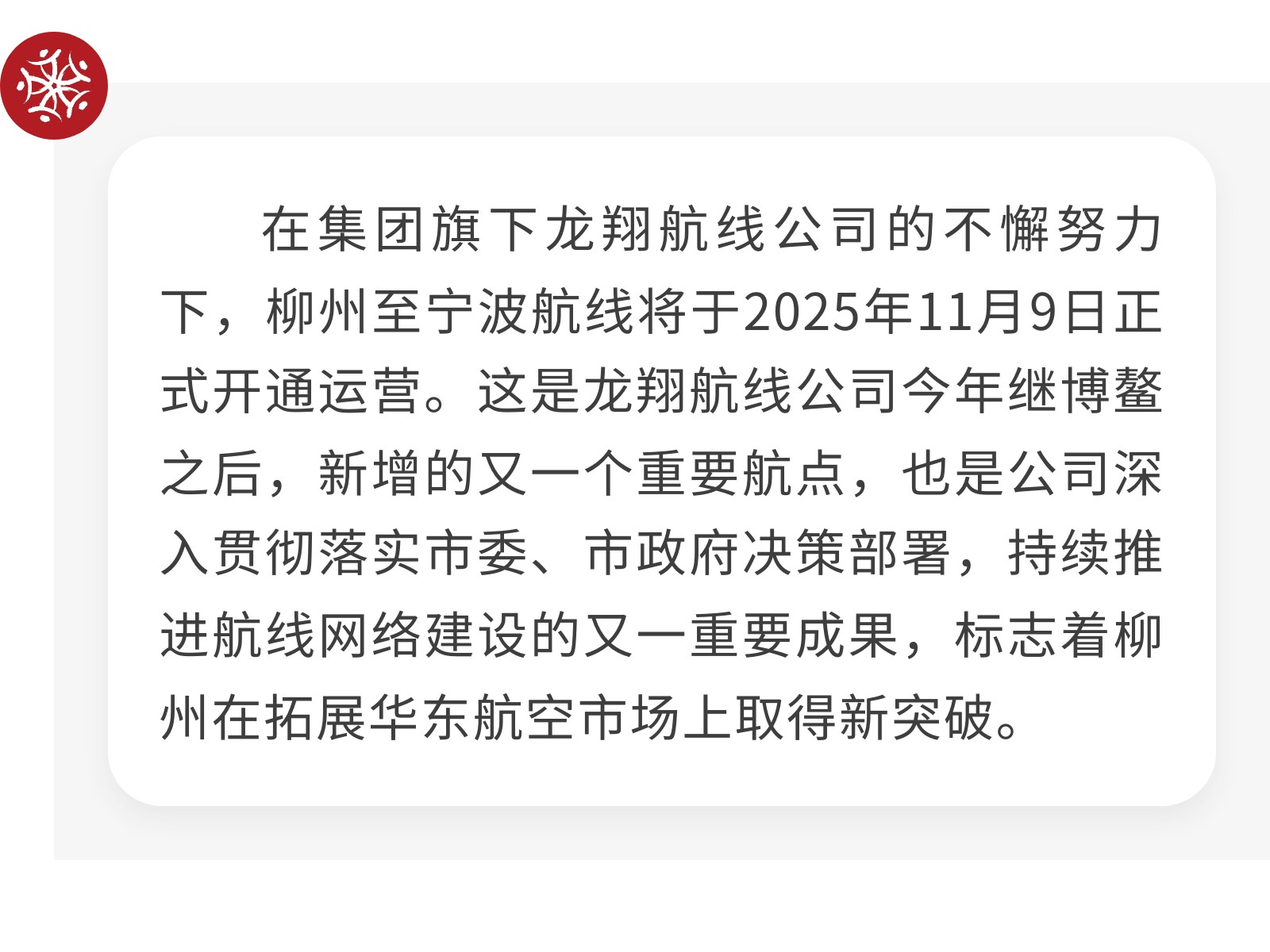 航線布局再突破!集團旗下龍翔航線公司成功開通寧波新航點 發布時間:2025年11月12日 11時來源:本站原創瀏覽:72 人次