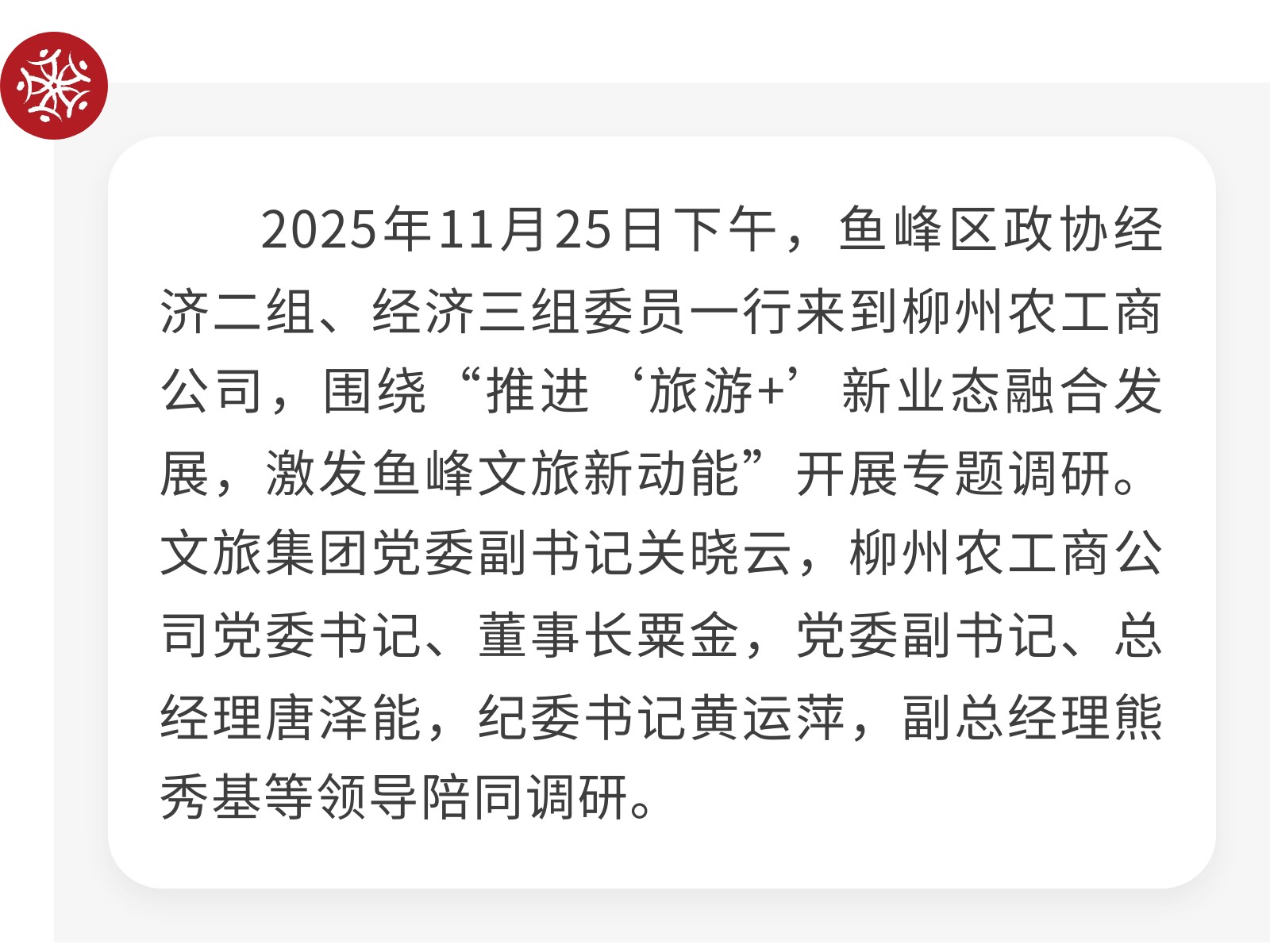 【政協(xié)來“把脈”,文旅添“動能”】魚峰區(qū)政協(xié)專題調(diào)研農(nóng)工商公司 發(fā)布時間:2025年11月28日 09時來源:本站原創(chuàng)瀏覽:96 人次